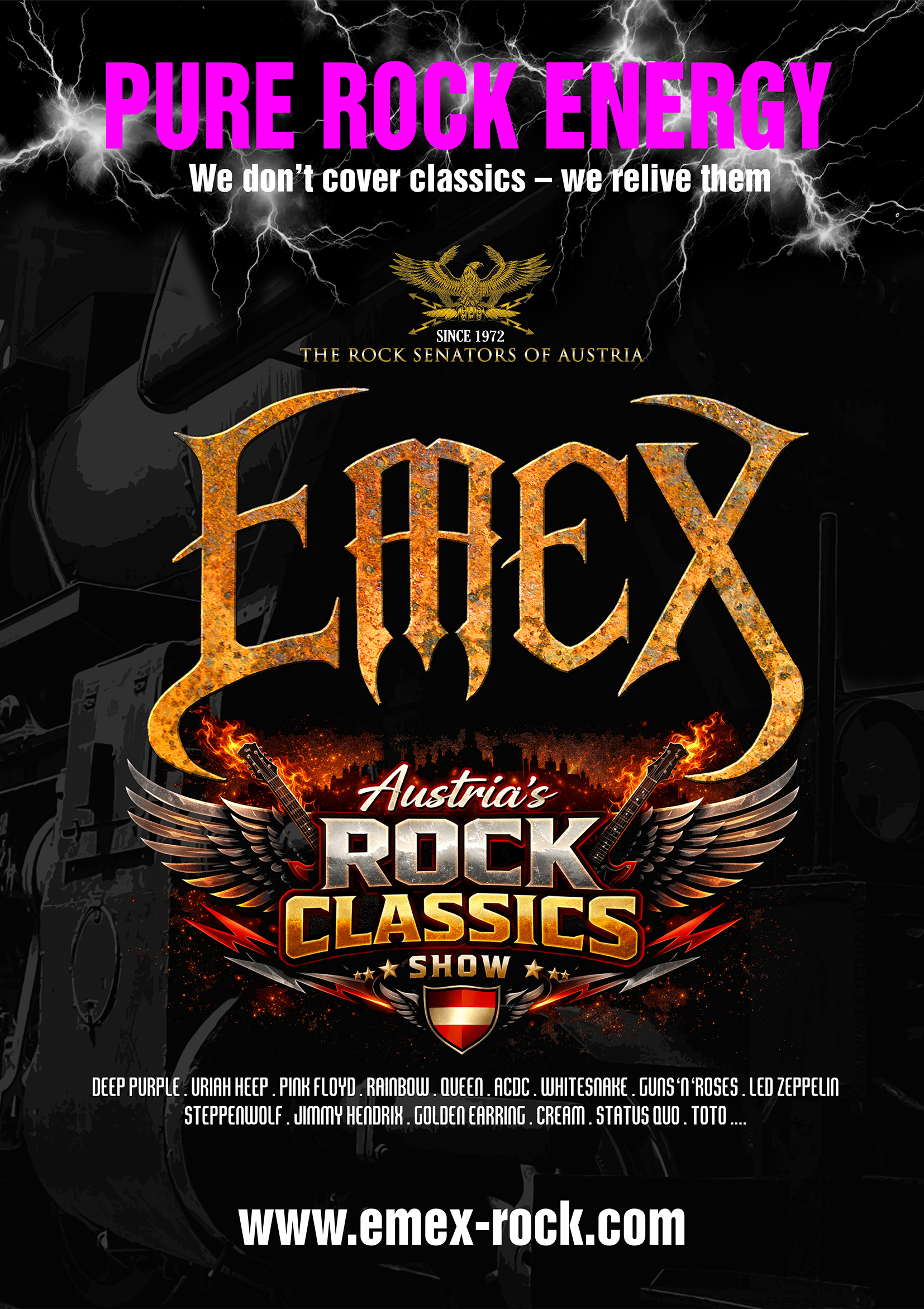 Kulturzentrum Marchfeld Strasshof - Halle 1 Immervoll-Strasse 6, 2231 Strasshof an der Nordbahn, NÖEMEX - LIVE 14. März 2026 Beginn: 19:30 Uhr Rock-Coverbands gibt es unzählige, aber keine wie EMEX. Die am längsten bestehende Rock-Classics-Band, kurz gesagt die Rocksenatoren Österreichs, zünden 54 Jahre […]